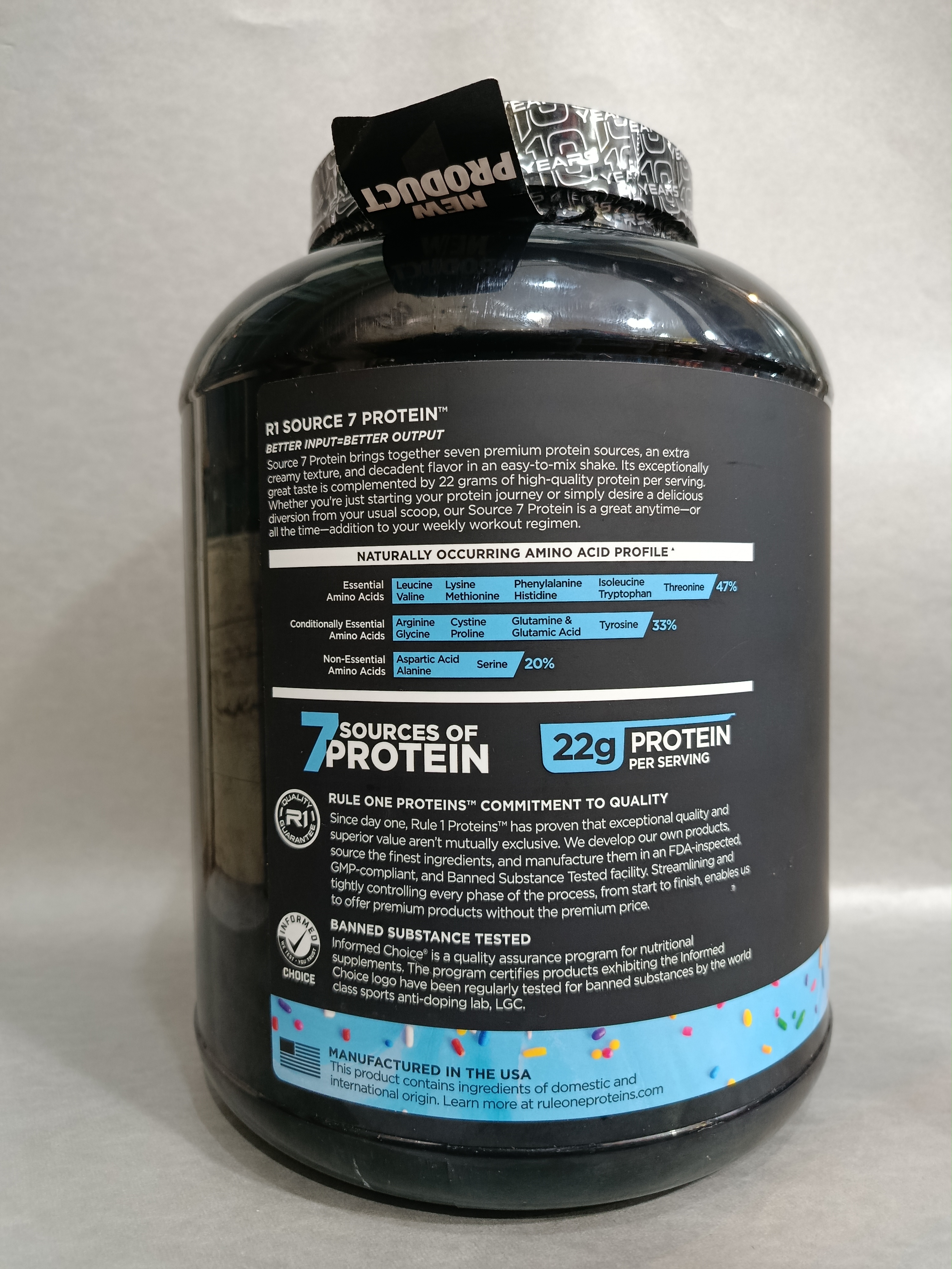 وی پروتئین رول وان مدل Source 7 Protein (طعم Cookies & Crème) هست. این پروتئین از خانوادهی مکملهای برند آمریکایی Rule 1 بوده و فرقش با ویهای معمولی (ایزوله یا کنسانتره ساده) اینه که ترکیبی از ۷ منبع مختلف پروتئین رو داره. همین باعث میشه جذب پروتئین در بدن هم سریع، هم متوسط و هم آهسته اتفاق بیفته و مدت بیشتری بدن در حالت تأمین اسیدهای آمینه قرار بگیره.