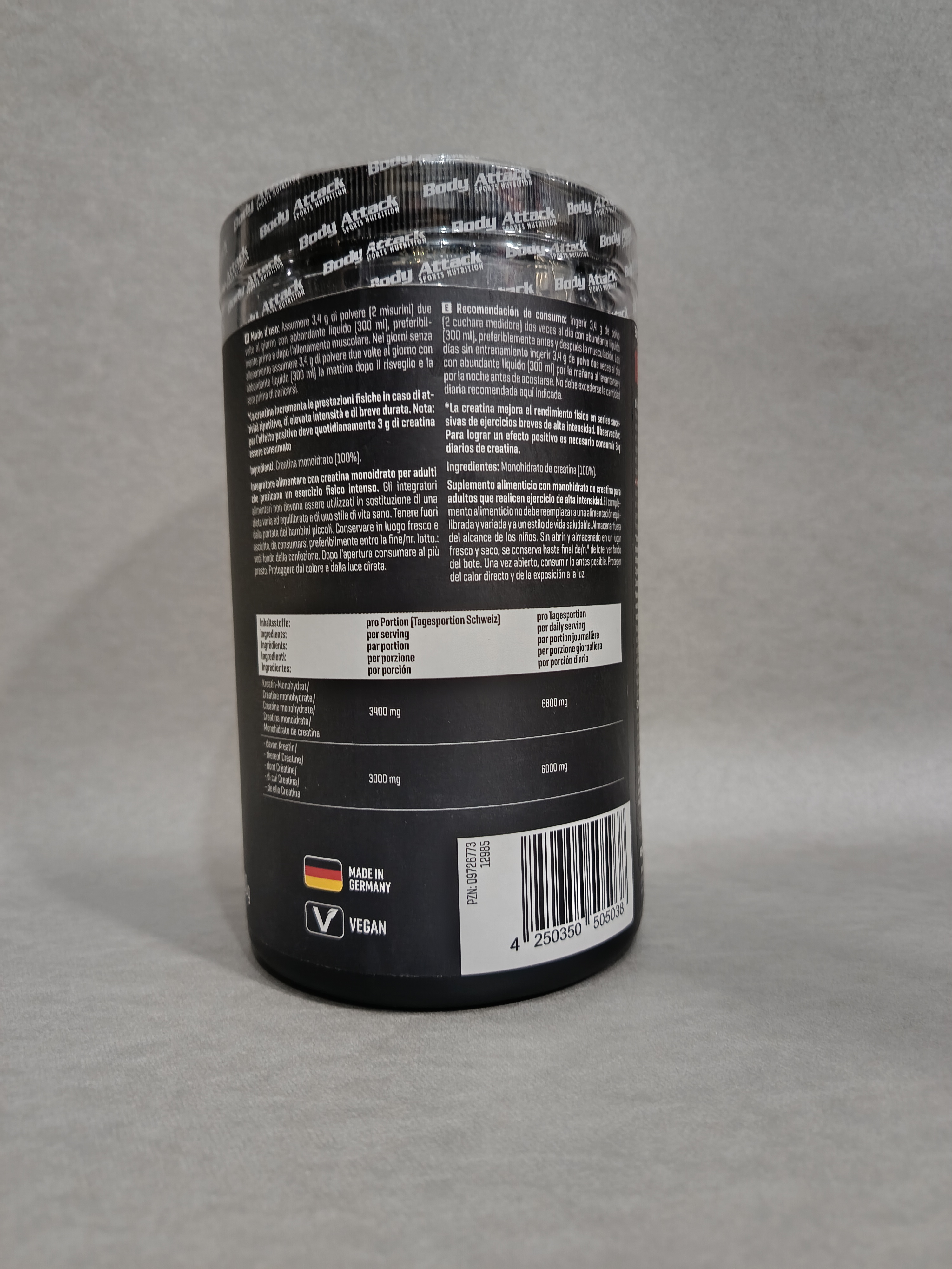 پیور کراتین بادی اتک 500 گرم Body Attack 100% Pure Creatine یک مکمل کراتین خالص است که از طریق فرایند میکرونیزه کردن ساخته می شود که جذب را در بدن بسیار ساده تر و سریعتر می کند. همچنین در طی یک فرایند فراوری دقیق، ناخالصی ها حذف می شود و کیفیت محصول تضمین می شود.بهبود عملکرد ورزشی با افزایش سطح انرژی و قدرت در زندگی روزمره و در طول تمرین.بهبود کلی در تامین انرژی میتوکندری، که نه تنها در عضلات، بلکه در مغز شما نیز وجود داردحمایت از روند ریکاوری بدن، ترویج خواب آرام و کاهش آسیب و التهاب بافت عضلانی.کراتین خالص حجم و تعریف عضلات را بهینه می کند و به دستیابی سریعتر به اهداف تمرینی کمک می کند.کراتین هم برای عضلات و هم برای مغز مفید استخستگی، افسردگی مزمن مرتبط با استرس را از بین می برد و به سلامت کلی شما کمک می کند.خرید پیور کراتین بادی اتک 500 گرم Body Attack 100% Pure Creatineبا مصرف پیور کراتین بادی اتک 500 گرم Body Attack 100% Pure Creatine می توانید قدرت خود را افزایش دهید. فرقی نمی کند برای دوی سرعتی یا انجام آخرین ست تمرین خود تلاش می کنید، با استفاده از مکمل بادی اتک می توانید به ریکاوری دست پیدا کنید و بهترین عملکرد ورزشی را داشته باشید. پودر کراتین مونوهیدرات بادی اتک بدون هیچ گونه ماده افزودنی ساخته شده است و به راحتی در آب یا آب میوه حل می شود.کراتین یک ماده طبیعی است که توسط بدن تولید می شود و از اسیدهای آمینه گلیسین، آرژنین و متیونین در کبد، کلیه ها و پانکراس تشکیل می شود. انواع مختلفی از کراتین وجود دارد. مونوهیدرات مخصوصاً به راحتی در بدن جذب می شود و ماده فعال قدرتمند در کراتین 100٪ خالص است. کراتین فسفات نقش مهمی در تامین انرژی بدن به ویژه در هنگام فعالیت کوتاه و شدید دارد. از این مزیت برای افزایش عملکرد بدنی خود در حین تمرین استفاده کنید.پیور کراتین بادی اتک 500 گرم Body Attack 100% Pure Creatine کراتین مونوهیدرات با کیفیت بالا را برای شما فراهم می کند بدون اینکه مواد افزودنی یا مواد زائد را دریافت کنید.طریقه مصرف کراتین مونوهیدرات بادی اتک3.4 گرم پودر (2 پیمانه) را دو بار در روز با مقدار زیادی آب (300 میلی لیتر) ترجیحاً قبل و بعد از تمرین عضلانی مصرف کنید. در روزهای بدون تمرین، 3.4 گرم پودر همراه با مایعات فراوان (300 میلی لیتر) صبح بعد از بیدار شدن و عصر قبل از خواب مصرف کنید.مکمل های غذایی جایگزین یک رژیم غذایی متعادل و متنوع نیستند. از دوز روزانه توصیه شده نباید بیشتر شود. محصول را دور از دسترس کودکان نگهداری کنید. به صورت درب بسته در جای خنک و خشک نگهداری شود. از گرما و نور مستقیم محافظت کنید.ارزش غذاییبه ازای3.4 گرمکراتین مونوهیدرات 3400 میلی گرمکراتین 3000 میلی گرممواد تشکیل دهنده: کراتین مونوهیدرات 100 درصد خالص