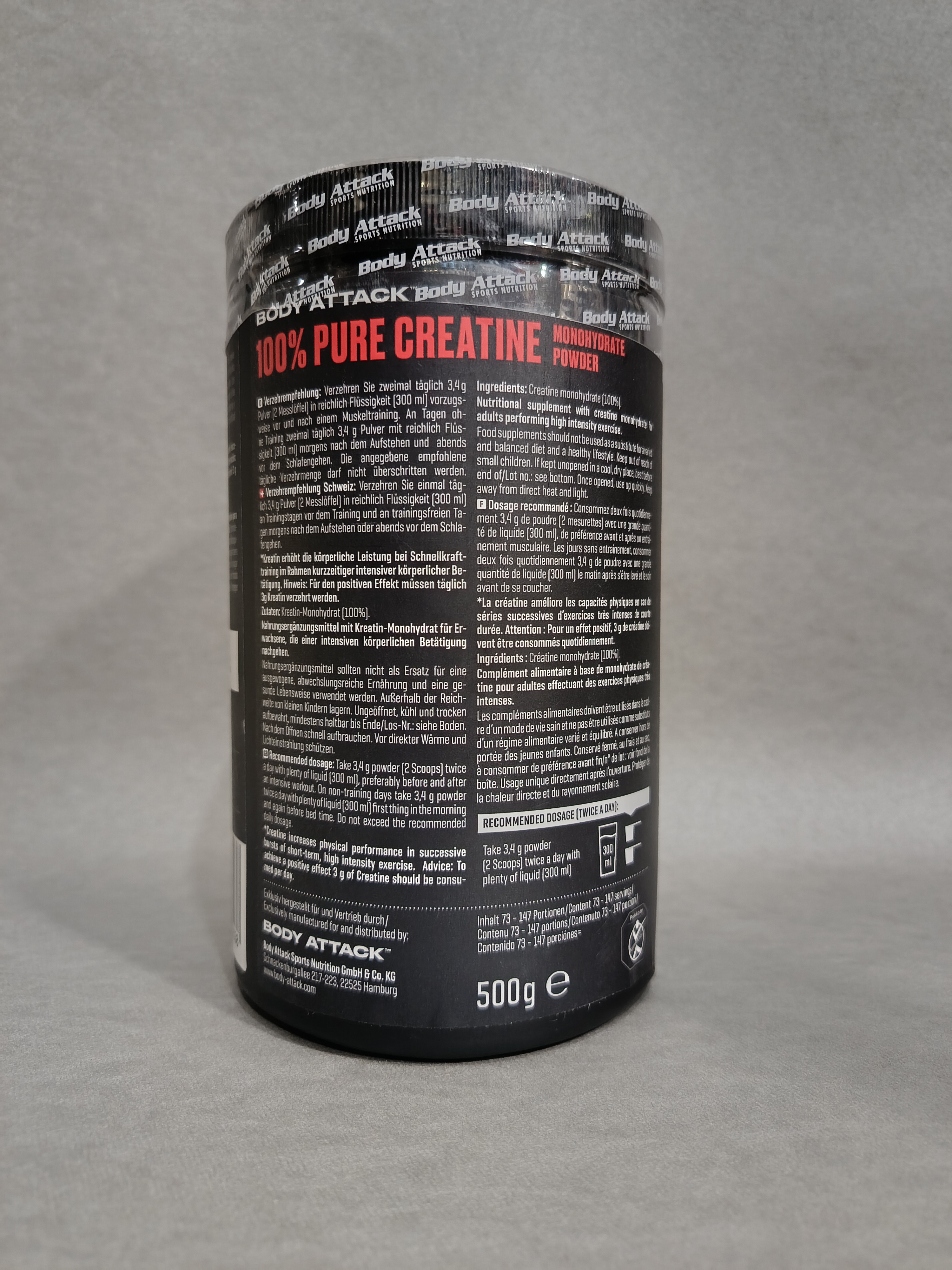 پیور کراتین بادی اتک 500 گرم Body Attack 100% Pure Creatine یک مکمل کراتین خالص است که از طریق فرایند میکرونیزه کردن ساخته می شود که جذب را در بدن بسیار ساده تر و سریعتر می کند. همچنین در طی یک فرایند فراوری دقیق، ناخالصی ها حذف می شود و کیفیت محصول تضمین می شود.بهبود عملکرد ورزشی با افزایش سطح انرژی و قدرت در زندگی روزمره و در طول تمرین.بهبود کلی در تامین انرژی میتوکندری، که نه تنها در عضلات، بلکه در مغز شما نیز وجود داردحمایت از روند ریکاوری بدن، ترویج خواب آرام و کاهش آسیب و التهاب بافت عضلانی.کراتین خالص حجم و تعریف عضلات را بهینه می کند و به دستیابی سریعتر به اهداف تمرینی کمک می کند.کراتین هم برای عضلات و هم برای مغز مفید استخستگی، افسردگی مزمن مرتبط با استرس را از بین می برد و به سلامت کلی شما کمک می کند.خرید پیور کراتین بادی اتک 500 گرم Body Attack 100% Pure Creatineبا مصرف پیور کراتین بادی اتک 500 گرم Body Attack 100% Pure Creatine می توانید قدرت خود را افزایش دهید. فرقی نمی کند برای دوی سرعتی یا انجام آخرین ست تمرین خود تلاش می کنید، با استفاده از مکمل بادی اتک می توانید به ریکاوری دست پیدا کنید و بهترین عملکرد ورزشی را داشته باشید. پودر کراتین مونوهیدرات بادی اتک بدون هیچ گونه ماده افزودنی ساخته شده است و به راحتی در آب یا آب میوه حل می شود.کراتین یک ماده طبیعی است که توسط بدن تولید می شود و از اسیدهای آمینه گلیسین، آرژنین و متیونین در کبد، کلیه ها و پانکراس تشکیل می شود. انواع مختلفی از کراتین وجود دارد. مونوهیدرات مخصوصاً به راحتی در بدن جذب می شود و ماده فعال قدرتمند در کراتین 100٪ خالص است. کراتین فسفات نقش مهمی در تامین انرژی بدن به ویژه در هنگام فعالیت کوتاه و شدید دارد. از این مزیت برای افزایش عملکرد بدنی خود در حین تمرین استفاده کنید.پیور کراتین بادی اتک 500 گرم Body Attack 100% Pure Creatine کراتین مونوهیدرات با کیفیت بالا را برای شما فراهم می کند بدون اینکه مواد افزودنی یا مواد زائد را دریافت کنید.طریقه مصرف کراتین مونوهیدرات بادی اتک3.4 گرم پودر (2 پیمانه) را دو بار در روز با مقدار زیادی آب (300 میلی لیتر) ترجیحاً قبل و بعد از تمرین عضلانی مصرف کنید. در روزهای بدون تمرین، 3.4 گرم پودر همراه با مایعات فراوان (300 میلی لیتر) صبح بعد از بیدار شدن و عصر قبل از خواب مصرف کنید.مکمل های غذایی جایگزین یک رژیم غذایی متعادل و متنوع نیستند. از دوز روزانه توصیه شده نباید بیشتر شود. محصول را دور از دسترس کودکان نگهداری کنید. به صورت درب بسته در جای خنک و خشک نگهداری شود. از گرما و نور مستقیم محافظت کنید.ارزش غذاییبه ازای3.4 گرمکراتین مونوهیدرات 3400 میلی گرمکراتین 3000 میلی گرممواد تشکیل دهنده: کراتین مونوهیدرات 100 درصد خالص