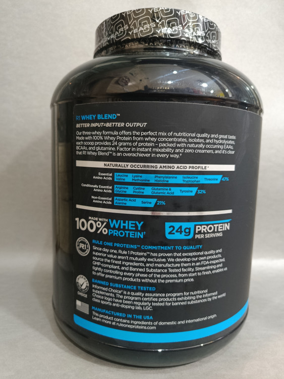 پروتئین وی رول وان، برای مصرف در شروع روز، قبل از تمرین یا بلافاصله بعد از تمرین، بین وعدههای غذایی یا به عنوان یک میان وعده مناسب است. این محصول برای اطمینان از کیفیت آن در مراکز ایالات متحدهی آمریکا، تولید میشود. پروتئین Rule One حاوی آمینواسیدهای ضروری است که برای ریکاوری و ترمیم عضلات مهم هستند. این محصول حاوی آمینو اسیدهای ضروری و پروتئین با کیفیت بالا، 24 گرم پروتئین وی صد در صد از کنستانتره وی ایزوله و هیدرولیزه با ای ای ایها و بی سی ای ایها و گلوتامین است.